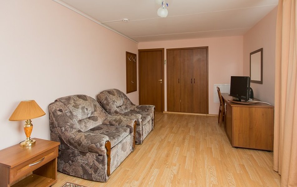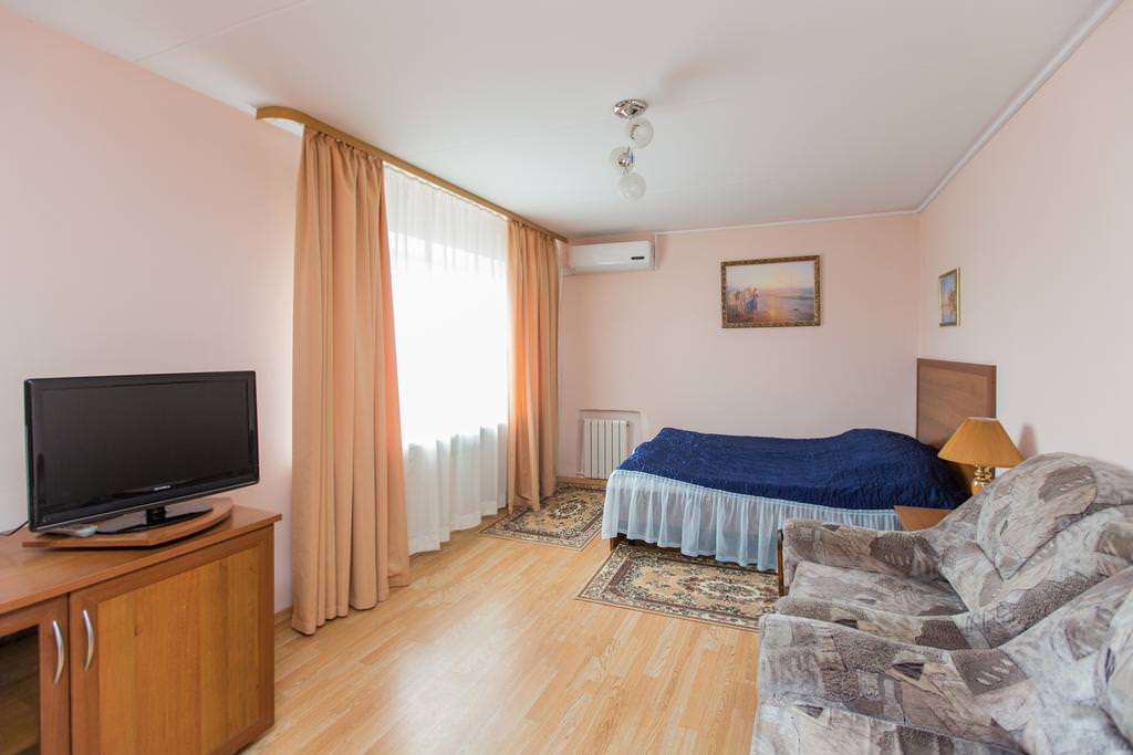 Комфортабельный номер для двоих. Для удобства гостей имеются телевизор, холодильник и электрочайник.
