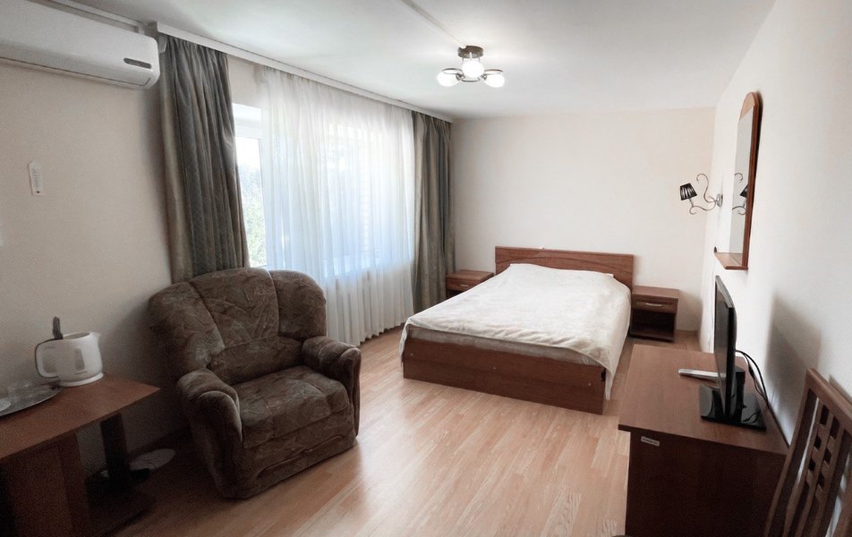Постояльцы смогут воспользоваться ЖК-телевизором, холодильником, кондиционером и электрочайником. Из мебели имеются прикроватные тумбочки, шкаф и письменный стол.